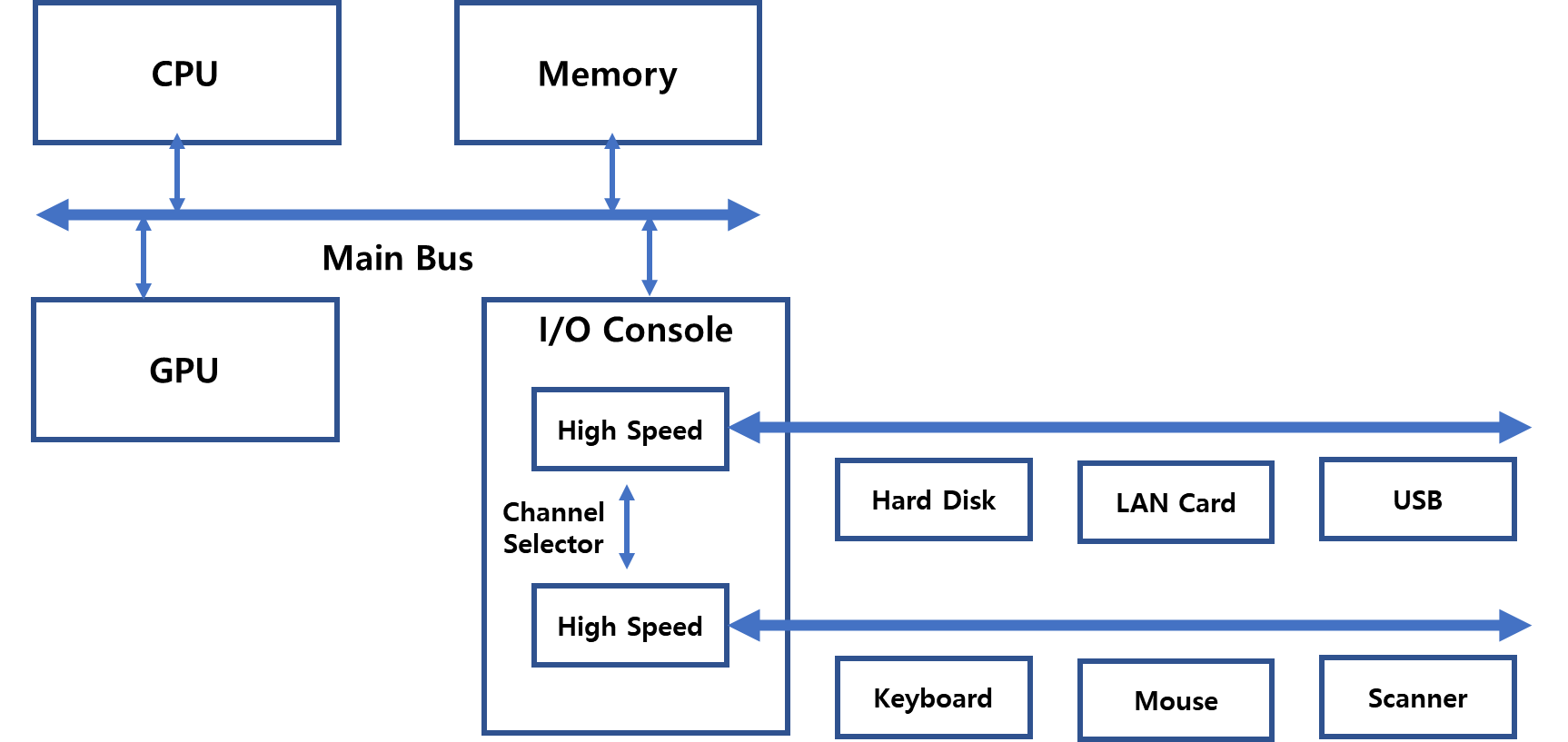 고속 주변장치가 키보드나 마우스 같은 저속 주변장치과 버스를 공유한다면 입출력 속도가 매우 저하되므로, 고속 입출력 버스와 저속 입출력 버스로 분리되어 운영된다. 두 버스 사이의 데이터 전송은 채널 선택기(Channel Selector)가 관리한다. 고속 입출력 버스에서 10번 데이터를 받고 저속 버스에서 1번 데이터를 받는 식이다.