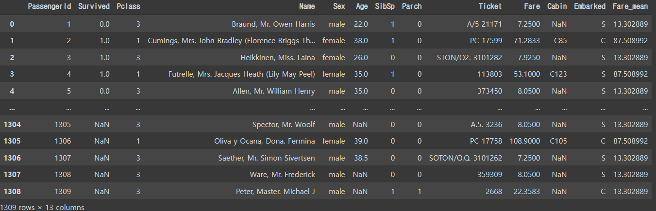 all_df.loc[(all_df["Fare"].isnull()), "Fare"] = all_df["Fare_mean"]