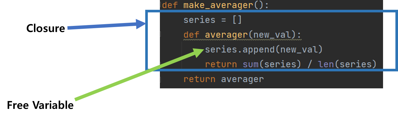 The key idea about closure you must understand is that it can access to 'nonlocal' variables outside the function.